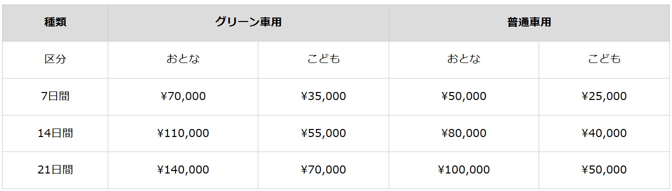 ジャパンレールパスにはグリーン車用と普通車用の2種類があり、さらにそれらが7日、14日、21日間用パスに分かれています。下記の表はジャパンレールパス引換証の料金表です。現地通貨における実勢価格は、引換証発行時のBSR(銀行売値)等により換算されます。訪日した際に、購入時の為替レートが訪日時の実勢引き換えレートと異なる場合があることをご了承ください。