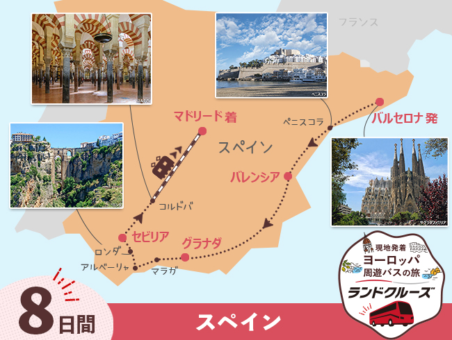 訪問はマドリード/プラド美術館・サンミゲル市場、バルセロナ/サグラダ・ファミリア、グラナダ/アルハンブラ宮殿、マラガ、ロンダ、セビリア、コルドバ。世界遺産や見所をしっかり網羅!