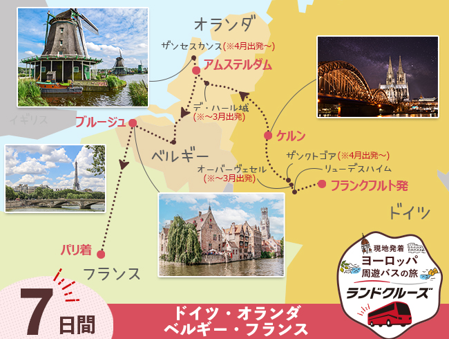 日本語現地係員が同行し、ドイツ、オランダ、ベルギー、フランスの人気都市を周遊する充実ツアー!